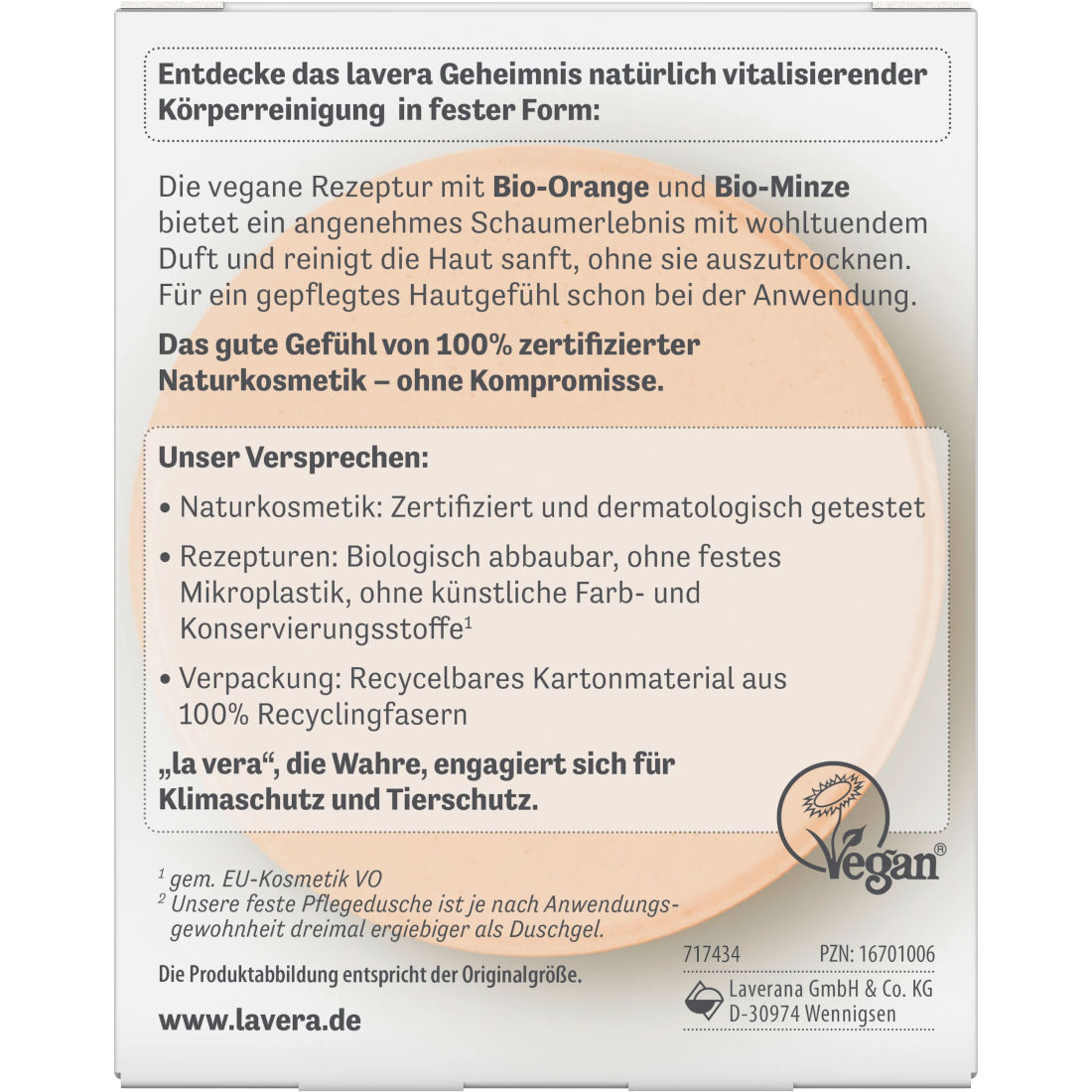 Entdecke das lavera Geheimnis natürlich vitalisierender Körperreinigung in fester Form: Die vegane Rezeptur mit Orange und Minze bietet ein angenehmes Schaumerlebnis mit wohltuendem Duft und reinigt die Haut sanft, ohne sie auszutrocknen. Für ein gepflegtes Hautgefühl schon bei der Anwendung.